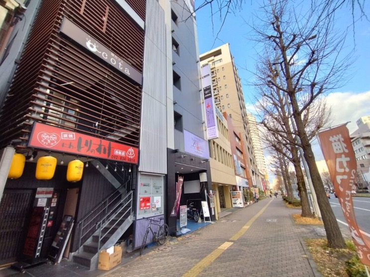 03にわ・とりのすけさんのお隣、紫の看板があるビルがスタジオです。